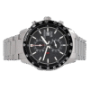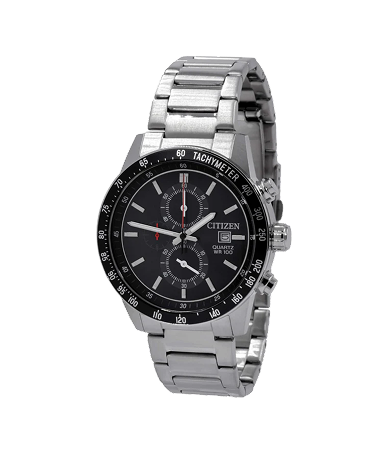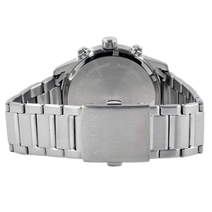 Citizen AN3600-59E men’s chronograph black dial bracelet watch is offered, in a polished solid stainless steel case. This watch measures 44mm across and 12mm thick. This watch has a fixed silver tone accents black bezel and a textured push/pull main crown with function pushers. Citizen AN3600-59E is equipped with a silver stainless steel bracelet. Securing the bracelet is a fold over push button clasp made in stainless steel.
