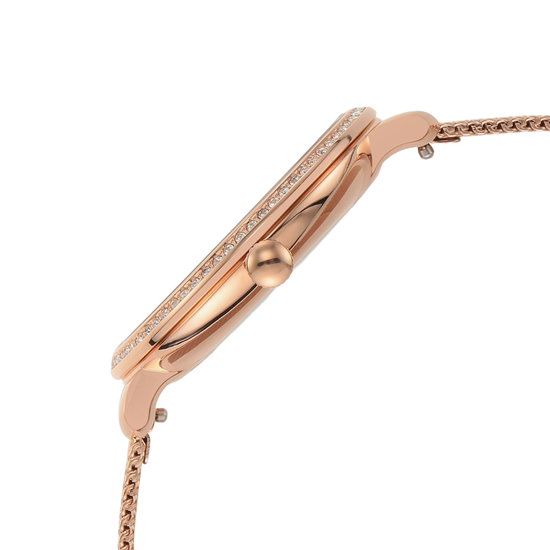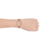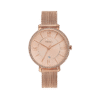 A 36 mm rose‑gold tone stainless steel women’s dress watch featuring a quartz three‑hand movement with date display. It has a glitz bezel, a rose‑gold sunray dial, mineral crystal, and is water resistant up to 3 ATM (30 m).