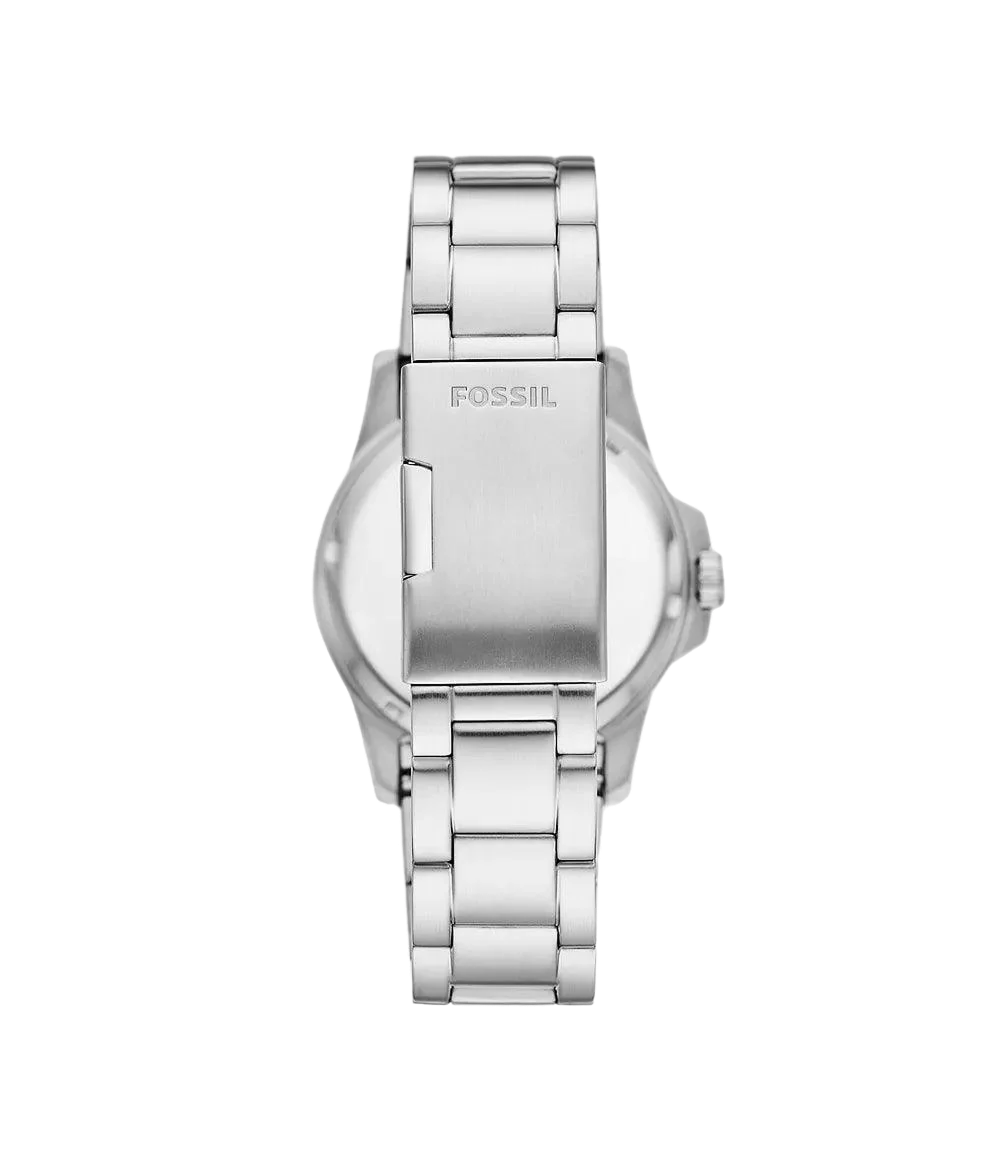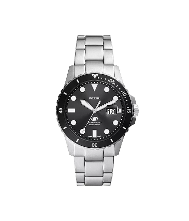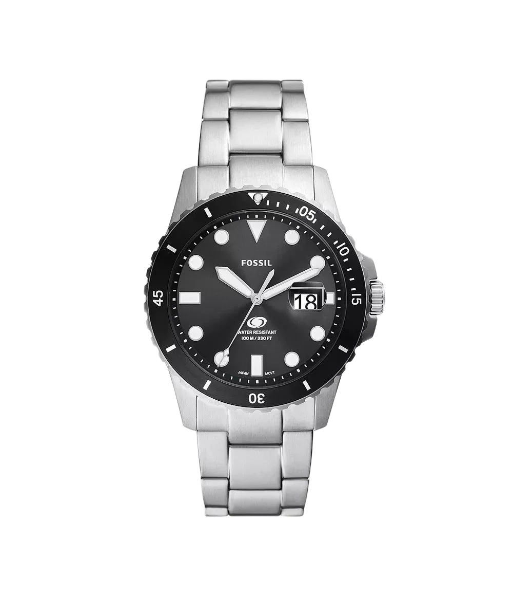 The FOSSIL FS6032I is a 42 mm dive‑style men’s watch with a stainless steel case and bracelet. It features a black sunray dial, a unidirectional rotating bezel, and a date window. The movement is quartz, and the watch is rated for 10 ATM (100 m) water resistance.